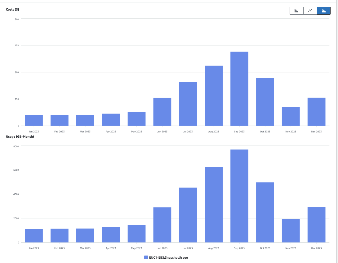 Une revue régulière aurait permis de questionner l’utilité de ces instantanés, et de définir le cas échéant le meilleur stockage pour ceux-ci (il y a un ratio de 53 entre Glacier Deep Archive – $0,00099 par Go.mois – et le stockage en ligne des instantanés – $0.053 par Go.mois).